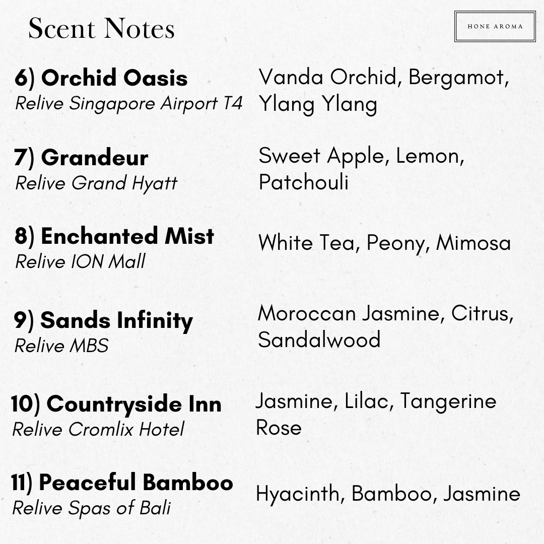 Note: All scents are Hone Aroma's recreation of places and hotels mentioned. Hone Aroma is not affiliated with any places mentioned and any copyright infringement was not intended.